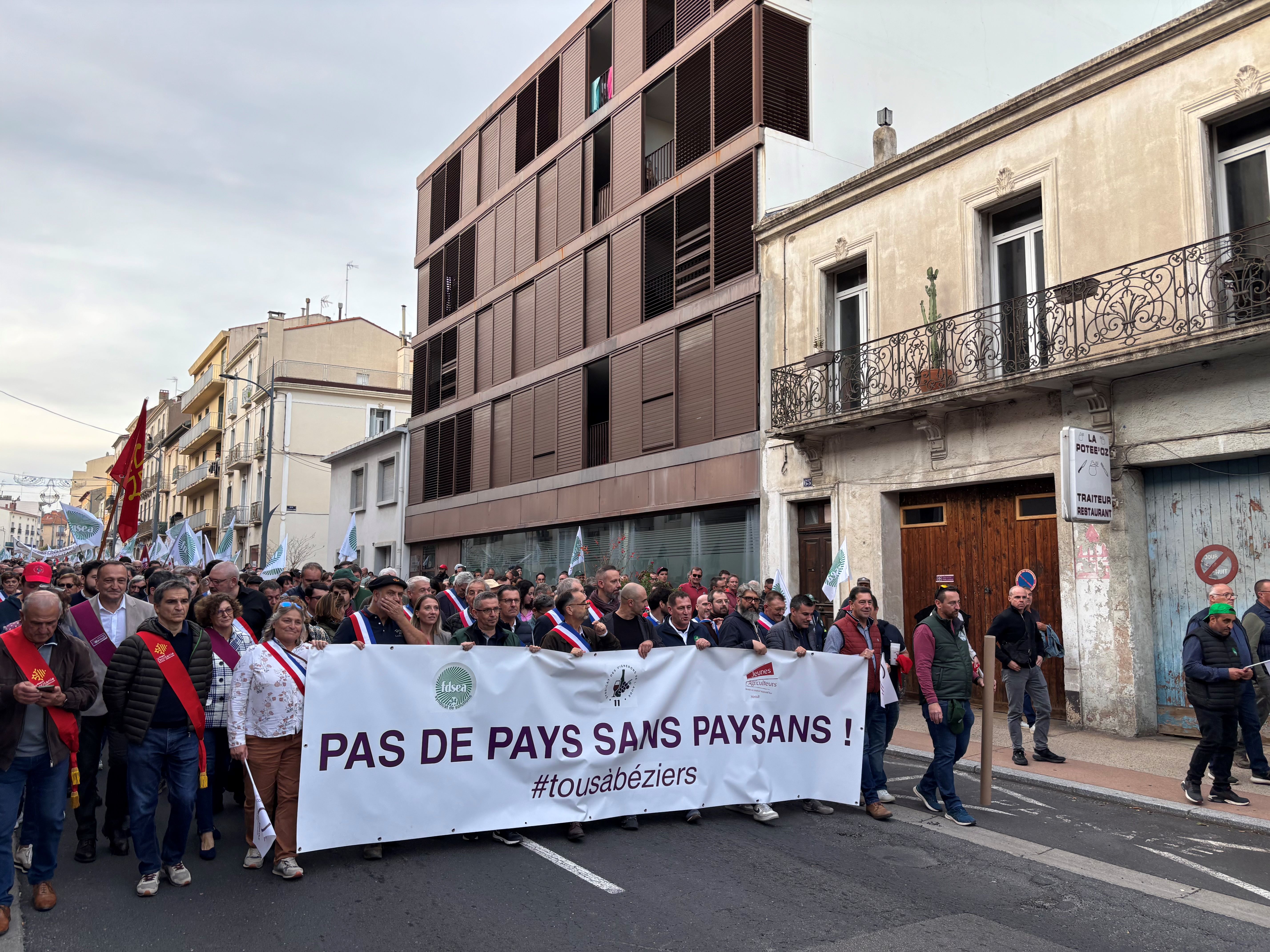 « Ce n’est pas une crise passagère, mais une alerte rouge, tout un territoire qui est au bord du gouffre », alerte ainsi à la tribune Damien Onorre avant de lancer la procession dans les rues de Béziers. Avant lui, Jérôme Despey en a presque perdu sa voix en demandant « le déblocage immédiat de 200 millions €, a minima, de la réserve de crise européenne pour sortir la viticulture de l’impasse ». Listant « les charges qui explosent, les contraintes qui s’alourdissent, les trésoreries à sec, les caves pleines, un marché atone, des prix qui ne permettent plus de vivre alors que la récolte est au plus bas », Damien Onorre souligne une crise « pas seulement agricole, mais aussi territoriale, humaine et culturelle ».