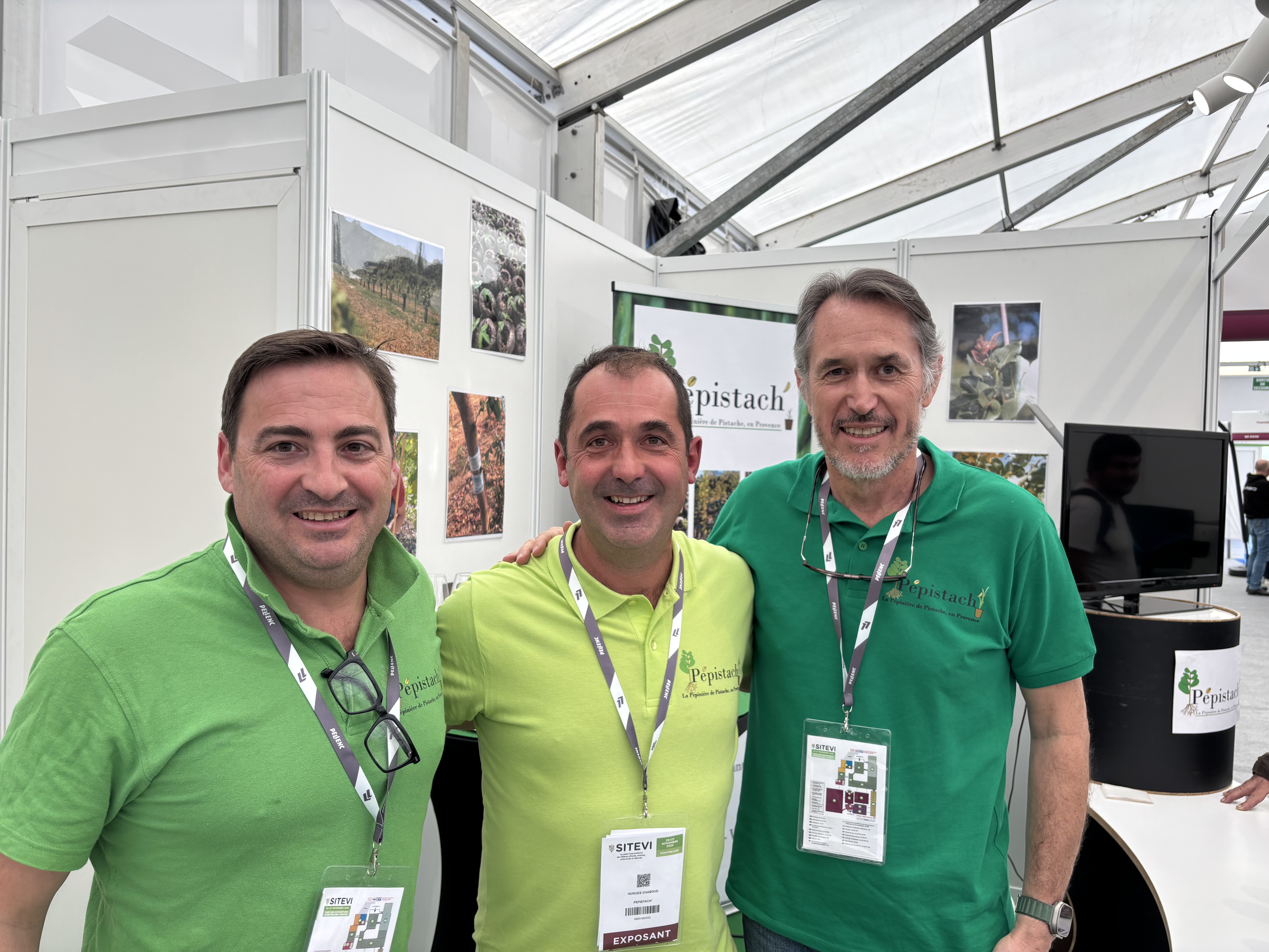 encontrés il y a deux ans à l’occasion du Sitevi 2023 pour décrire leur aventure de diversification dans la production de pistache, à travers la structure Pépistach’, les deux vignerons varois Hugues Chaboud et Thomas Paul étaient de retour lors de cette édition 2025, poursuivant la promotion de la filière de pistache verte émondée qu’ils s’évertuent à construire depuis 2017. « Ces deux dernières années nous ont surtout permis de fiabiliser notre travail de pépinière, en arrivant maintenant à 70 % de taux de réussite de greffage de nos plants », valide Thomas Paul. Ils indiquent fournir des plants à hauteur d’une soixantaine d’hectares de pistachiers plantés par an, « avec des agriculteurs qui passent à une 2ème phase de plantation après avoir démarré sur un demi ou un hectare », valide Thomas Paul.
