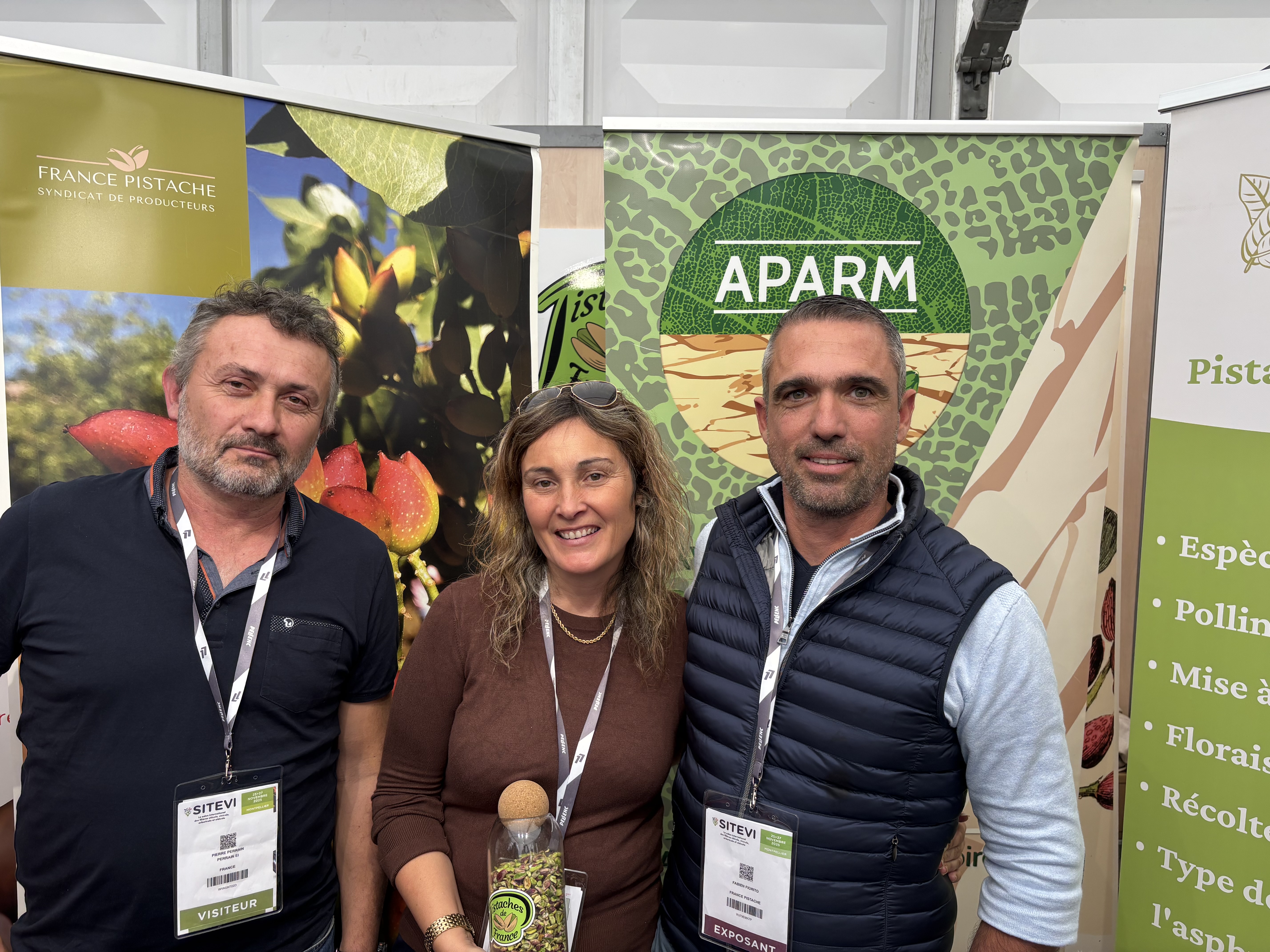 A proximité, un autre stand, estampillé France Pistache, le stand du syndicat de producteurs fondé en 2021 (sur la base déjà existante de l’association Pistache en Provence ), propose d’autres orientations que la pistache verte émondée, et indique que « la filière française de la pistache compte aujourd’hui près de 550 hectares de plantations répartis entre régions Sud et Occitanie, ainsi qu’en Corse et le sud de la région Auvergne-Rhône-Alpes ». Soit environ 120 producteurs ayant fait le choix de cette voie de diversification, pour un arbre arrivant en première production 5 ans après la plantation. Soutenant que le marché français représente 10 000 tonnes de pistaches par an, toutes importées, France Pistache indique qu’il y a des places à prendre pour la pistache d’origine française, alors que cette culture s’adapte autant aux conditions climatiques de chaleur ou de sécheresse estivale qu'aux températures hivernales. La floraison tardive, entre fin mars et fin avril, « le rend également peu sujet aux risques de gelées printanières », comme l’indique France Pistache.