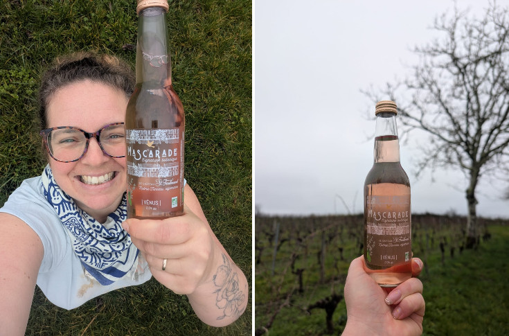 e se retrouvant pas dans les méthodes de désalcoolisation des vins, mais entendant les injonctions du marché à proposer des boissons sans alcool, le vigneronne Noémie Tanneau (château Saint-Ferdinand à Lussac Saint-Émilion) s’essaie au jus de raisin bio avec la gamme "Mascarade", mais avec trois petits plus : des infusions, du verjus et de la gazéification. « Je me considère comme vigneronne » pose Noémie Tanneau, qui avait « l’idée d’apporter quelque chose de très simple, qui ait du goût, mais sans conservateur et avec peu de sucre par rapport aux jus de raisin habituels (entre 6 et 7 g/l au final). J’ai travaillé des infusions de plantes avec deux recettes : Vénus à base de menthe bergamote (qui apporte des notes citronnées), de menthe poivré et de thym citron. Luna avec callune, bruyère, cynorrhodon et aubépine. » Le tout assemblé avec du jus de raisin et du verjus, du jus de raisins n’étant pas mûrs. Le jus de merlot et le verjus sont achetés à un domaine du Bergeracois bio, un prestataire met les jus en bouteilles de 33 cl et les pasteurise (ces jus millésimés 2025 sont consommables jusqu’en 2028).
