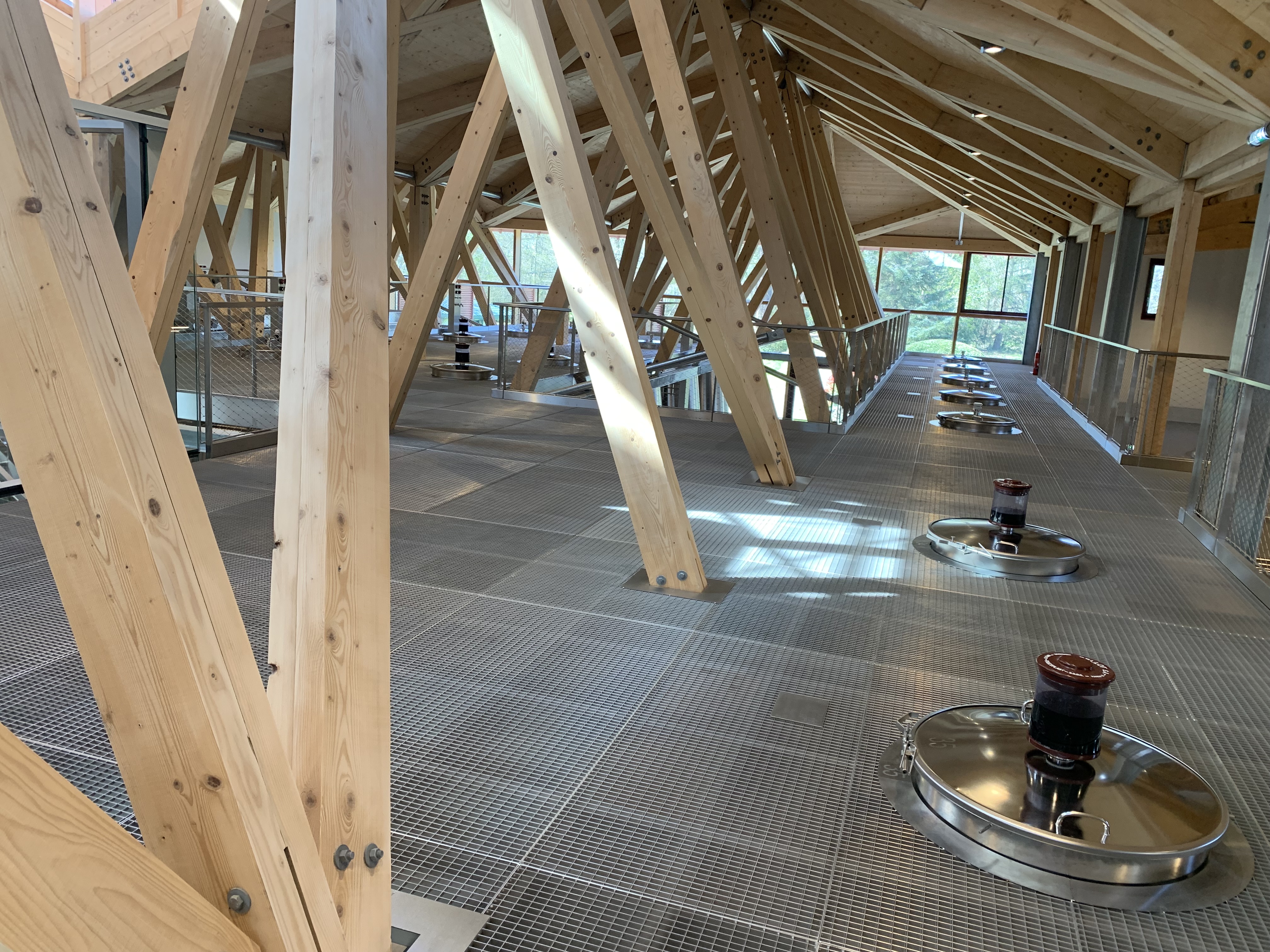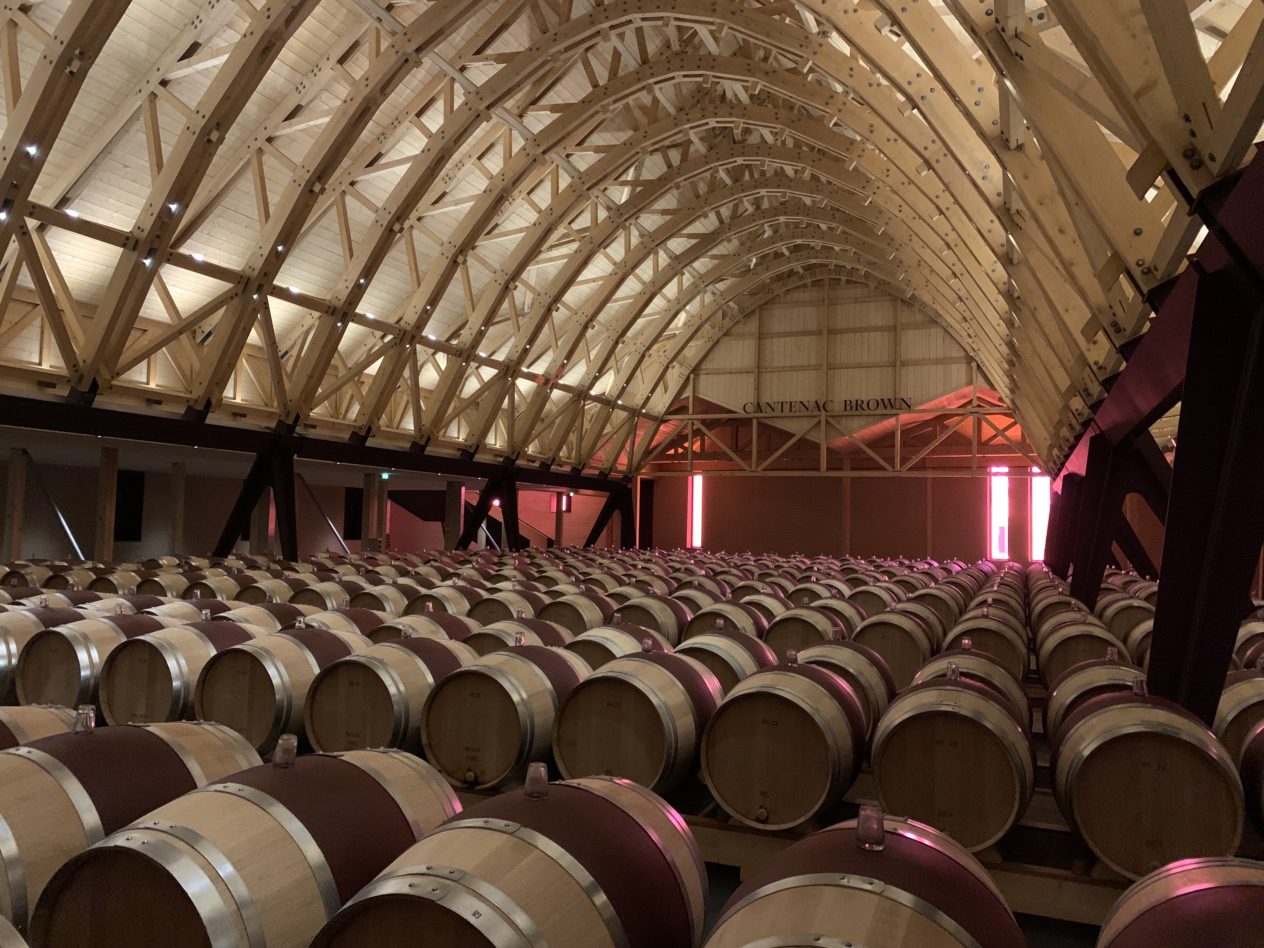 Dans son ensemble, l’outil de production du château Cantenac Brown allie l’écoconception (cuves en inox polymiroir pour faciliter le nettoyage et réduire la consommation d’eau…) et l’amélioration des conditions de travail (gigantesque halle de 500 m² pour l’arrivée des vendanges, pas de bruit autres que les ascenseurs dans le cuvier…). Ainsi que la hiérarchisation de l’image de marque : le château historique prime, l’outil technique le complète tout en restant en retrait. En témoigne le jeu de toitures du cuvier, qui fait en sorte d’être bien plus bas que le château pour rester en retrait dans les perspectives. « Le chai n’écrase pas le château, qui est notre signature » relève José Sanfins, qui n’est pas peu satisfait par l’effet de l’impressionnante arche du nouveau chai à barrique. Pouvant accueillir deux récoltes sur deux étages (avec 2 500 tonneaux), cette imposante structure en bois et métal sera une étape marquante des visites de la propriété (rouvrant au public en mai, après l’inauguration de la propriété lors des primeurs, fin avril).