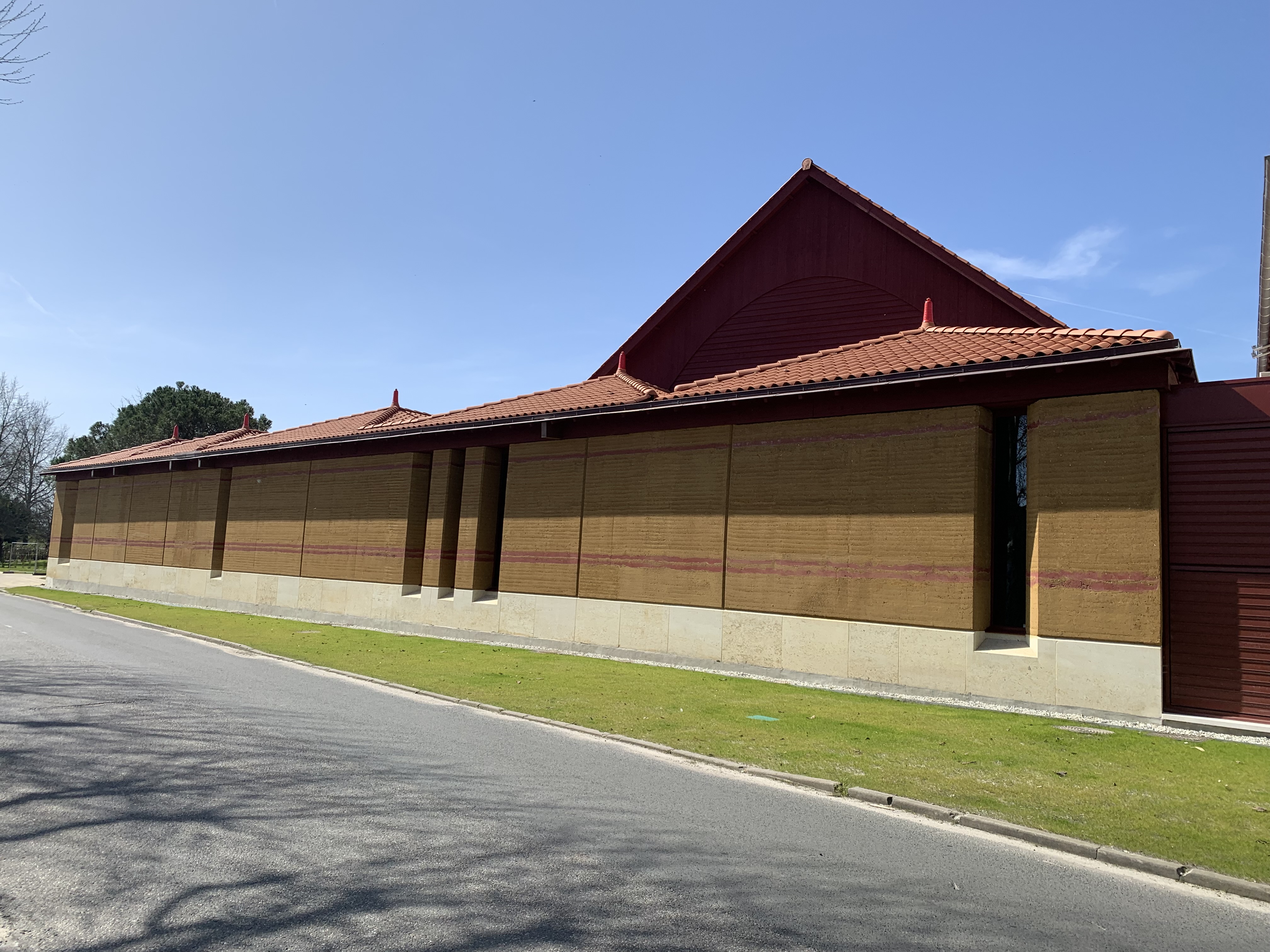 Visibles depuis la route, les lignes rouges du mur en terre crue sont la seule fantaisie apparente de ce bâtiment rénové.