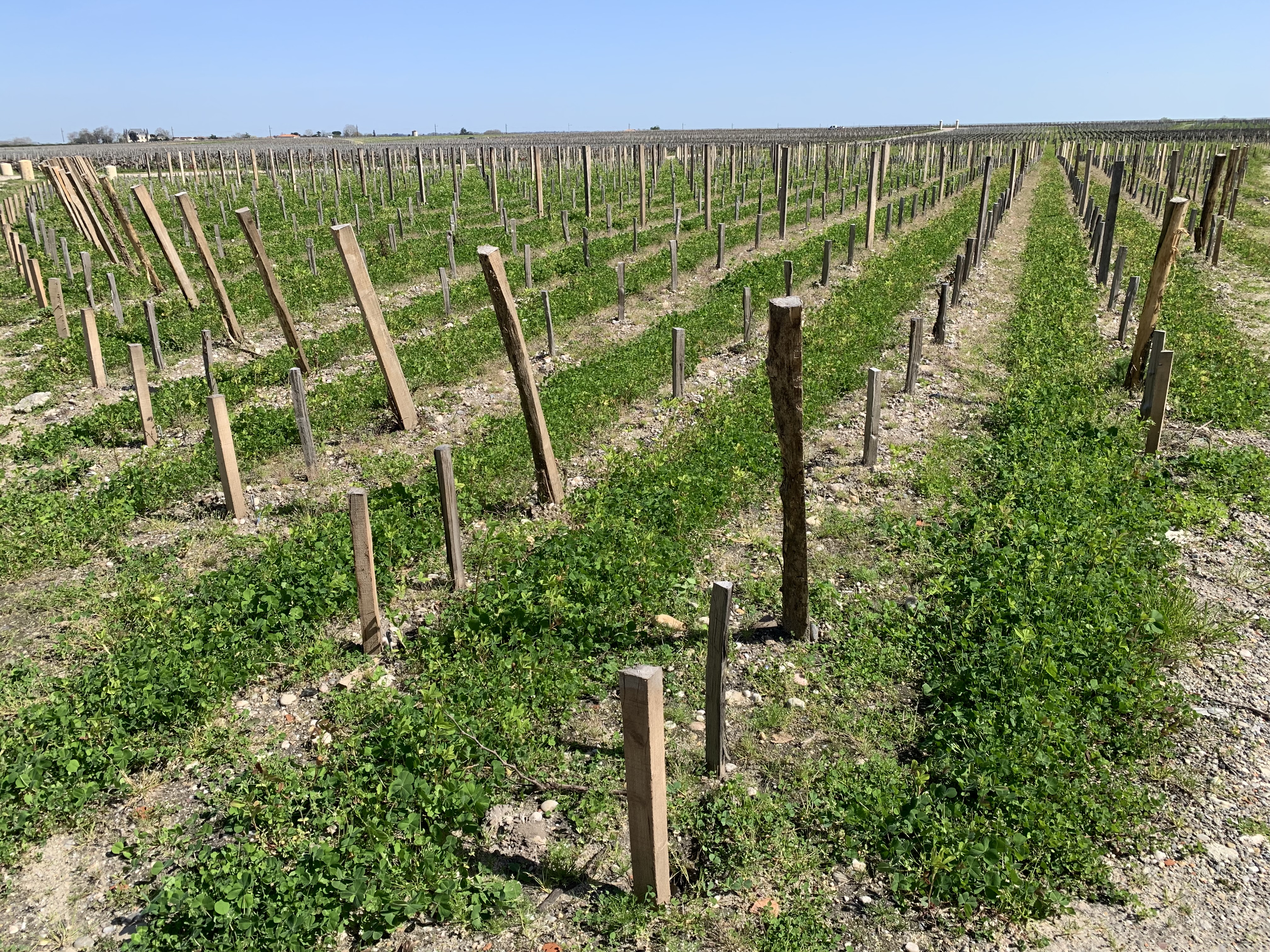 Souci du détail, les jeunes vignes de cabernet sauvignon devant le domaine ont été semées de trèfle nain, qui aura une couleur carmin rappelant la ligne rouge du chai.