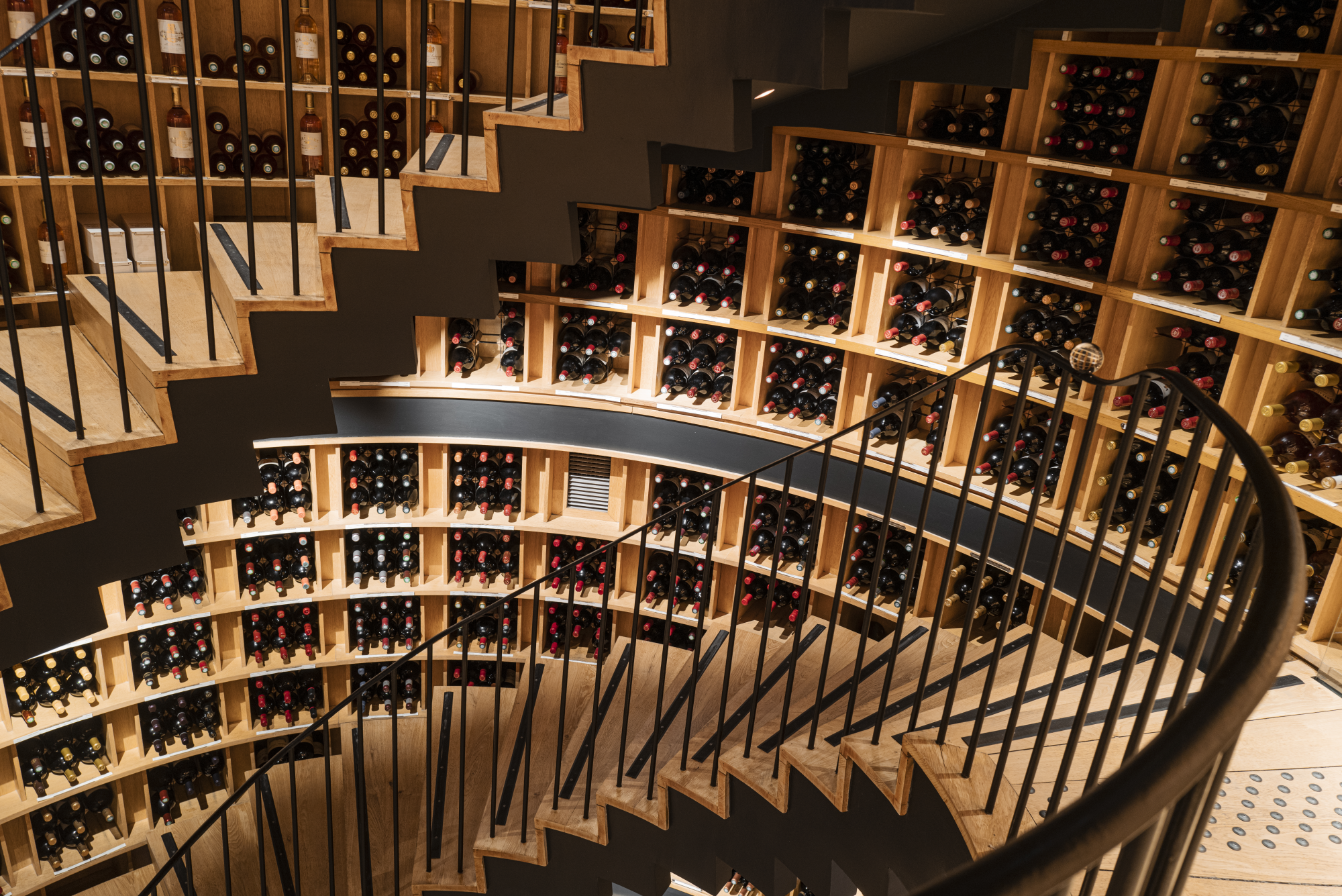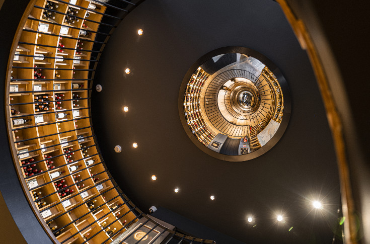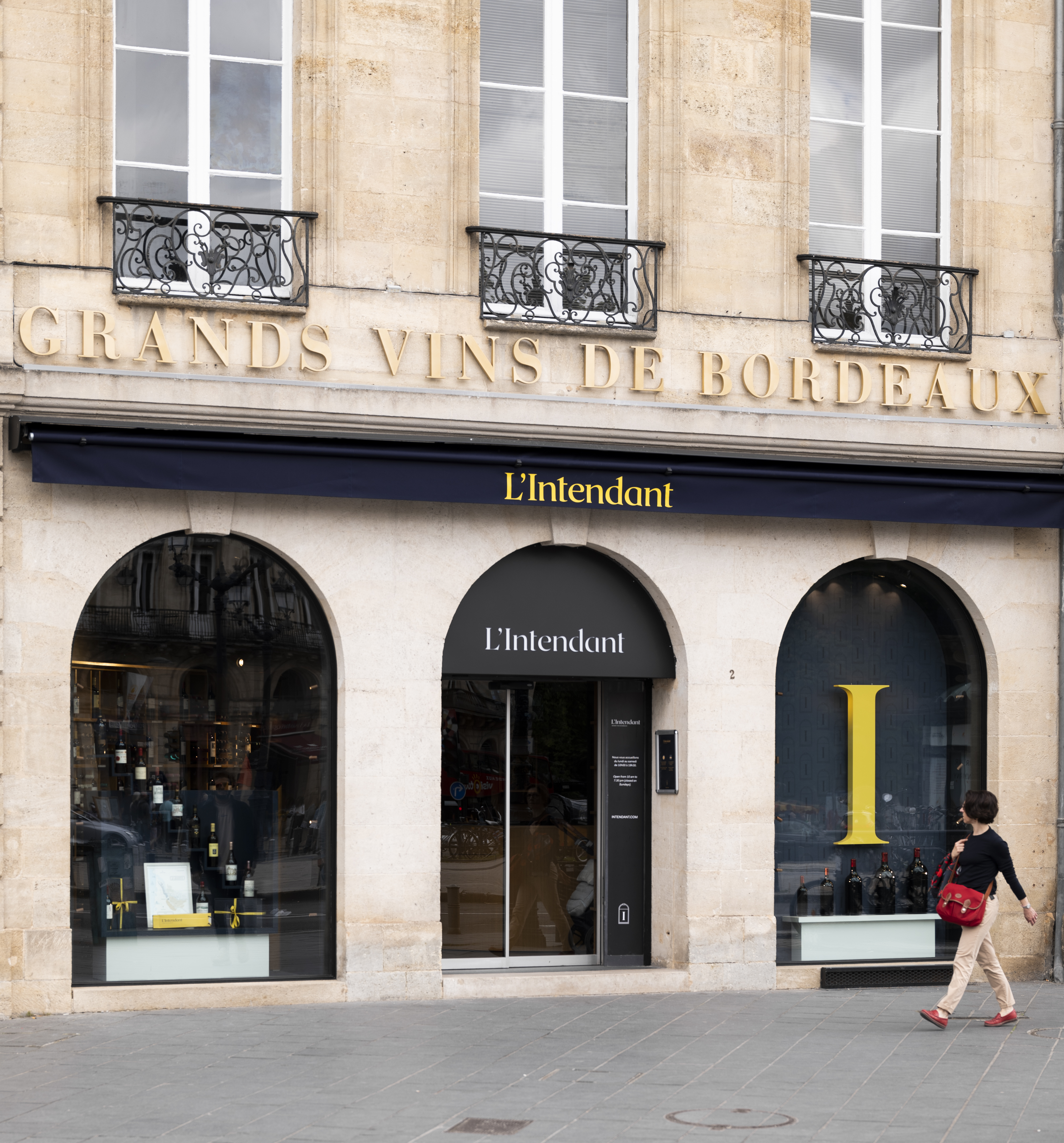 e changement saute aux yeux dès l’entrée : des couleurs bleues tranchent avec celles crèmes/boisées signant jusque-là l’identité de l’Intendant, caviste emblématique du centre de Bordeaux (le triangle d’or) appartenant au groupe Duclot (famille Moueix). Ayant réouvert ce lundi 13 mai après plus de 4 mois de travaux d’envergure (ses premiers depuis son ouverture en 1989), le point de vente a aéré son point d’accueil/caisse, a clarifié sa segmentation des vins panneaux AOC, s’est doté d’un espace de dégustation à l’étage, a tamisé l’éclairage… Et peut fêter ses 35 ans avec un lifting à tous les étages : la cave ayant la particularité de se déployer sur cinq niveaux, du rez-de-chaussée au quatrième étage, en passant par un escalier continuant de dérouler les 1 200 casiers à vin de l’Intendant. Conservé, cet ADN vertical est accentué par un imposant miroir convexe trônant au plafond et centré sur la cage d’escalier : de quoi affirmer la profondeur de millésime et de gamme que propose le caviste, comme le souligne malicieusement Éva Dieudonné, la directrice de l’Intendant.
