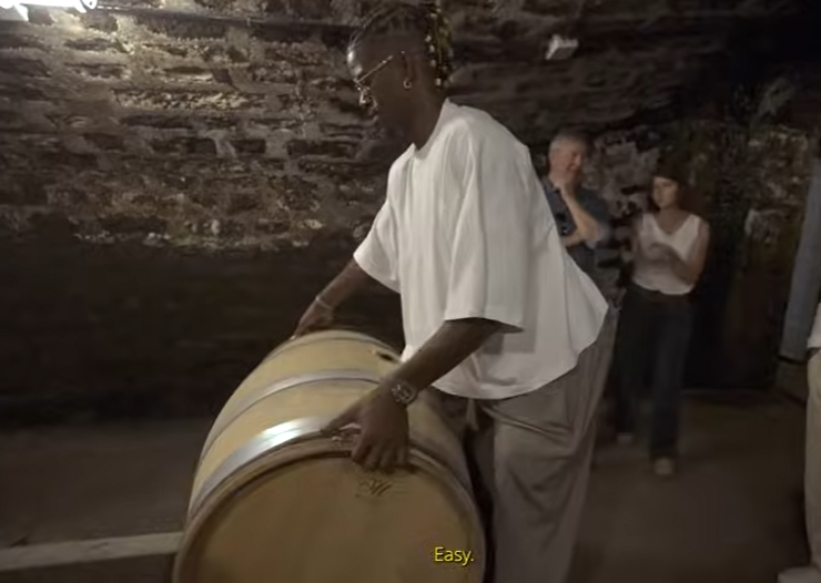 Maître de chai, Géraldine Godot lui apprend comment faire rouler les barriques. Jimmy Buttler est moins à l’aise que sur le parquet.