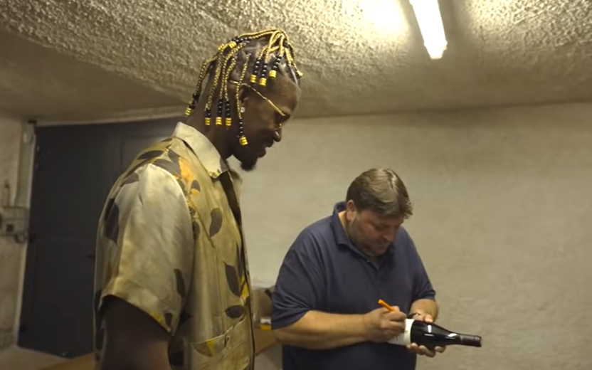 Après une soirée grillades au Château d’Armand Heitz, près de Chassagne-Montrachet, Jimmy Buttler est de retour à Morey-Saint-Denis, chez Jérôme Castagnier, qui le taquine en commençant à dédicacer une bouteille « Dear Kevin Love… ». Bon joueur, le basketteur rigole.