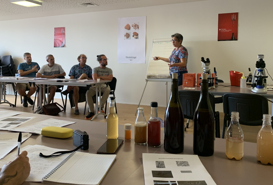 Avant de passer derrière la paillasse et d’observer les moûts qu’ils ont amenés avec eux, Delphine Engel fait un tour de table pour lister les conditions d’une bonne fermentation.