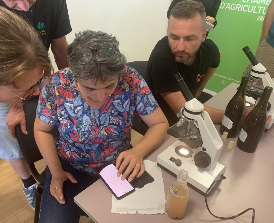 yant accompagné de nombreux vignerons du Beaujolais dans l’observation au microscope des pieds de cuve et des moûts en fermentation lorsqu’elle travaillait pour la Chambre d’agriculture du Rhône, l’œnologue Delphine Engel a fait un saut à la maison des vins de Tain-L’Hermitage ce 5 septembre pour partager son expérience à 12 vignerons venus de la Drôme, d’Ardèche, et même de Haute-Loire et de Haute-Savoie. La majorité réalise des vinifications carboniques en grappes entières sans levures sèches actives. Qu’ils fassent ou non des pieds de cuve et soient équipés d’un système de refroidissement, tous ces vignerons ont déjà dû faire face à des piqûres acétiques ou lactiques. Ils espèrent que le microscope les aidera à mieux lutter contre la flore indésirable.
