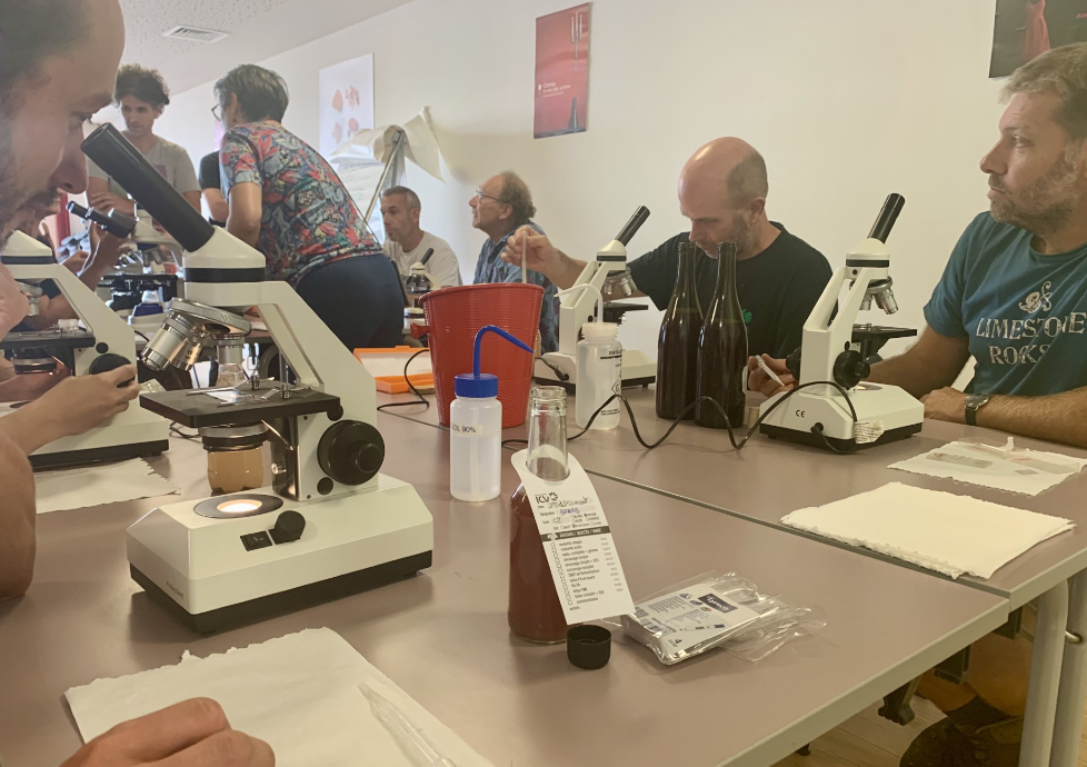 Après leur avoir donné la recette d’un bon pied de cuve, l’œnologue apprend aux vignerons à reconnaître les principales levures et bactéries pouvant être présentes durant la fermentation. Elle les invite à passer derrière un des huit microscopes mis à leur disposition. Ces appareils sont capables de faire un grossissement x600. Les vignerons déposent une goutte de leur moût en respectant un angle de 45° entre la pipette et la lamelle sèche. Certains testent une cellule de Malassez, plus pratique à utiliser et permettant de décompter les populations. Certains ajoutent du bleu de méthylène pour distinguer les cellules mortes. Ils attendent 10 minutes, le temps que les vivantes excrètent le colorant et que les éventuelles bactéries, 40 fois plus petites que les levures, sédimentent. « Vous pouvez profiter de ce temps pour déguster vos échantillons, sans laisser la lame sous la lampe pour éviter que le liquide s’évapore », indique Delphine Engel.