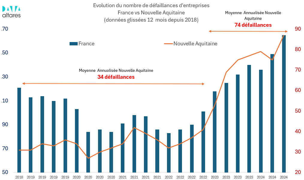 Relevant « la "faiblesse" des volumes » concernés sur « un seul trimestre », Thierry Millon, le directeur des études Altares préfère « lire l’évolution des défaillances d’entreprises viticole (culture de la vigne) en données annualisées (calcul 12 mois glissées chaque fin de trimestre) » ce qui donne un graphique (ci-dessous) montrant que « jusqu’en fin 2022 la sinistralité viticole de Nouvelle aquitaine (à plus de 80 % girondine) est contenue autour d’une moyenne de 34 défaillances sur 12 mois, mais qu’à partir de début 2023 le rythme accélère pour, en moyenne, plus que doubler (74 contre 34). De plus on observe que la Nouvelle-Aquitaine est de plus en plus représentée dans la sinistralité viticole française (de 31 % en 2018-2020 à 41 % sur 2020-2023). Quand la Gironde faiblit, c’est la viticulture qui trinque. »