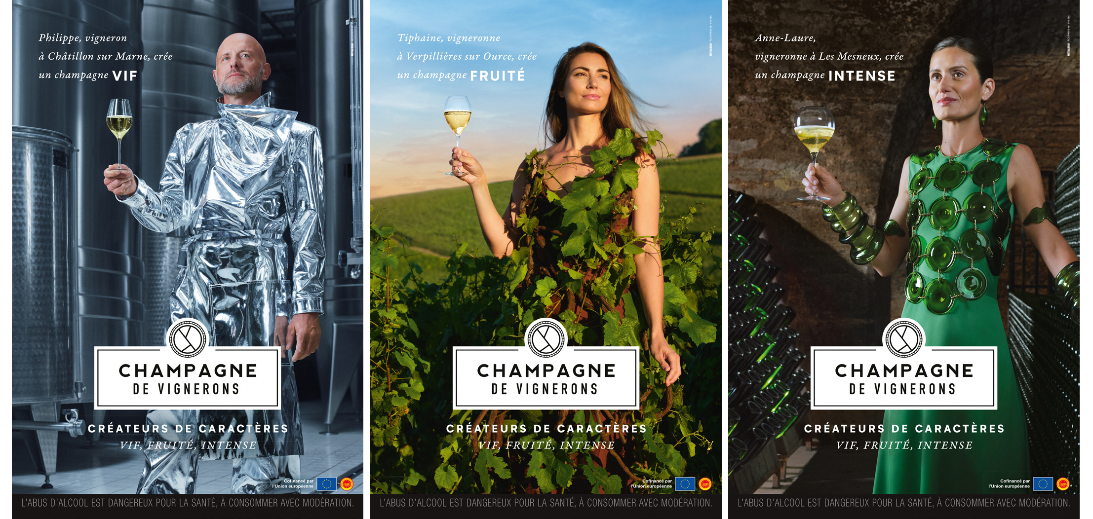 « Nous sommes fiers de lancer cette nouvelle campagne de communication des Champagnes de Vignerons, déclare Maxime Toubart, président du syndicat général des vignerons (SGV). Nous souhaitons présenter des vignerons en situation, avec de l’authenticité. Nous avons travaillé avec un créateur de mode, qui a mis en avant les trois adjectifs qui caractérisent les champagnes : vif, fruité et intense ». Cette campagne comprend six visuels. Les trois premiers, dévoilés le 30 octobre chez les cavistes, sont des natures mortes qui présentent une coupe au sein d’un chai, dans les vignes et dans une cave de vieillissement. Les trois nouveaux visuels, présentés ce mercredi 6 novembre et visibles ci-dessous, mettent en scène un viticulteur qui arbore un tablier métallique faisant penser aux cuves inox, une viticultrice dont la robe est composée de sarments et de rameaux et enfin une autre viticultrice parée d’un bustier et de bijoux en verre soufflé.