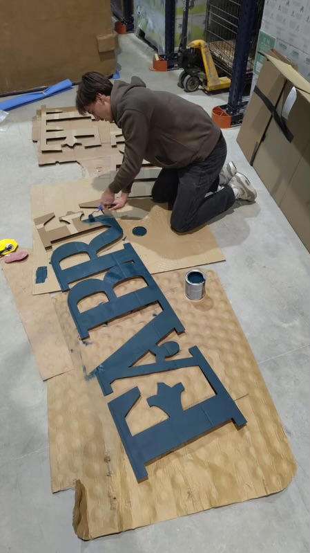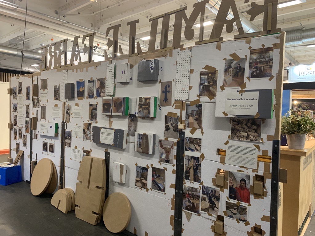 Pour revaloriser des déchets de carton (venant du domaine ou non) en un stand (mur, comptoir, carte en relief, supports et mobilier allant des tables aux chaises), la famille Fabre a fait appel aux matières recyclées collectées par l’entreprise de réinsertion MP2 Environnement et aux apprentis de l’École de la transition écologique (Etre) de Lézignan-Corbières (Aude), au FAB LAB de Limoux (également chantier d’insertion) et à l’agence Divino (pour le pilotage et l’agencement du projet). « La viticulture est la richesse du territoire » résume Clémence Fabre, saluant les prouesses de ce stand : un défi technique étant de réaliser en carton un mur de 6 mètres de long et 2 mètre de haut. Un autre challenge étant d’avoir un rendu qui ne fasse pas recyclage bas de gamme pour accueillir des clients et prospects. « Les plus difficiles à convaincre étaient nos commerciaux, qui ne voulaient pas d’un stand poubelle » rapporte Clémence Fabre, se rappelant avoir montré des meubles en carton pour les rassurer : « ça ne se voit pas, le carton peut être habillée pour avoir un rendu très joli ».