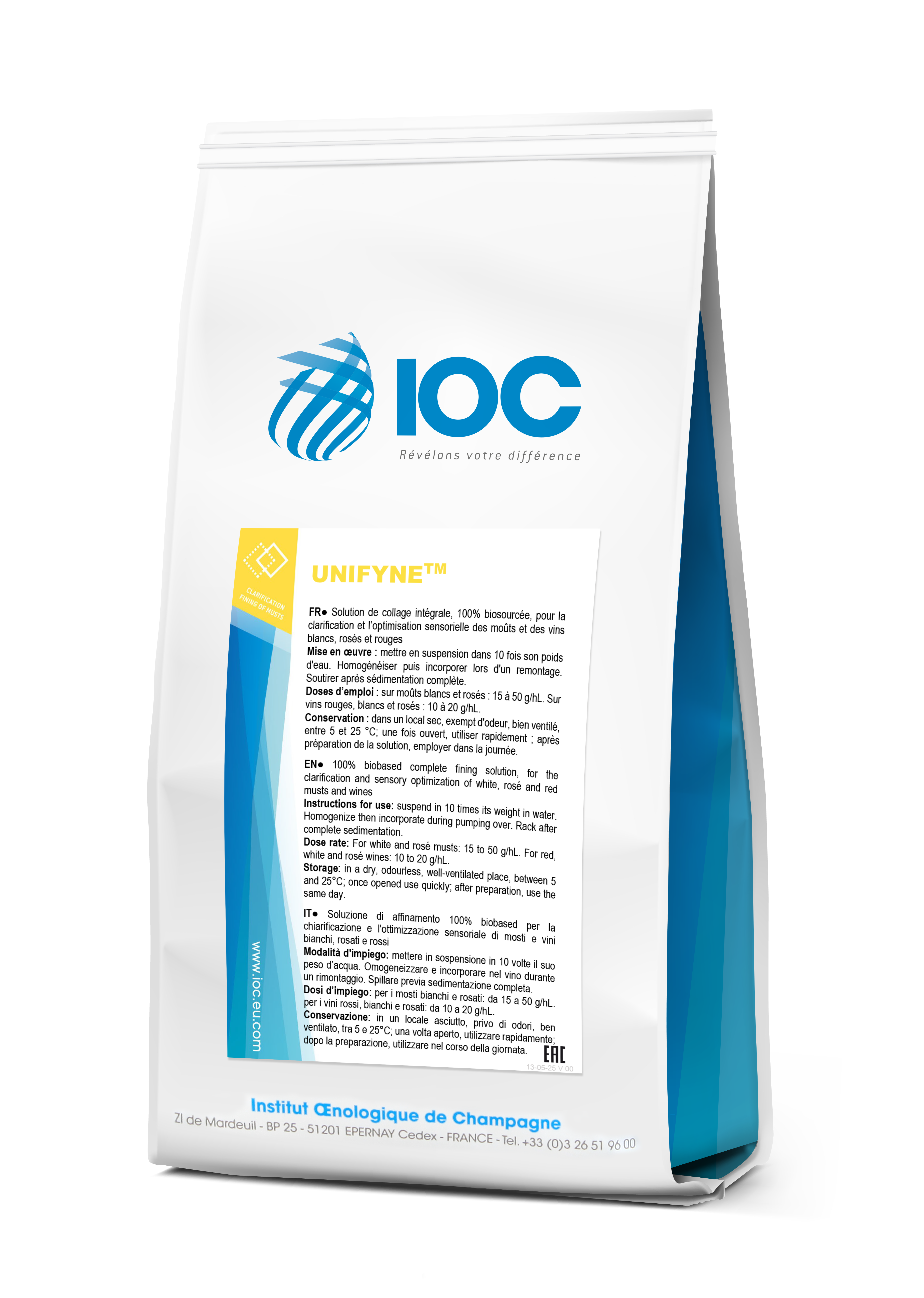 « Nous souhaitions offrir une colle polyvalente, que l’on puisse utiliser sur moûts ou sur vins rouges, blancs et rosés pour les clarifier et les stabiliser », explique Rebecca Nougier, chef produit à l’IOC pour la clarification, stabilisation et finition des vins. C’est chose faite avec Unifyne, un nouvel agent de collage 100% biosourcé à base d’extraits protéiques de levures, de protéines de pois, de chitosane et de bentonite. « Unifyne s’utilise entre 20 et 50g/hL sur moût et entre 10 et 20 g/hL sur vins ». Idéal aussi pour diminuer les références de produits.