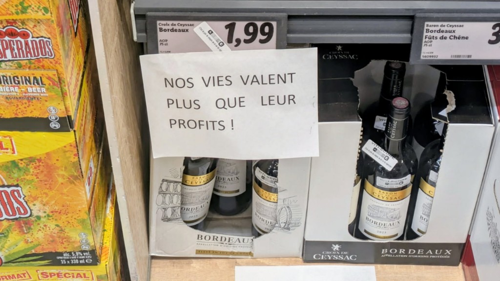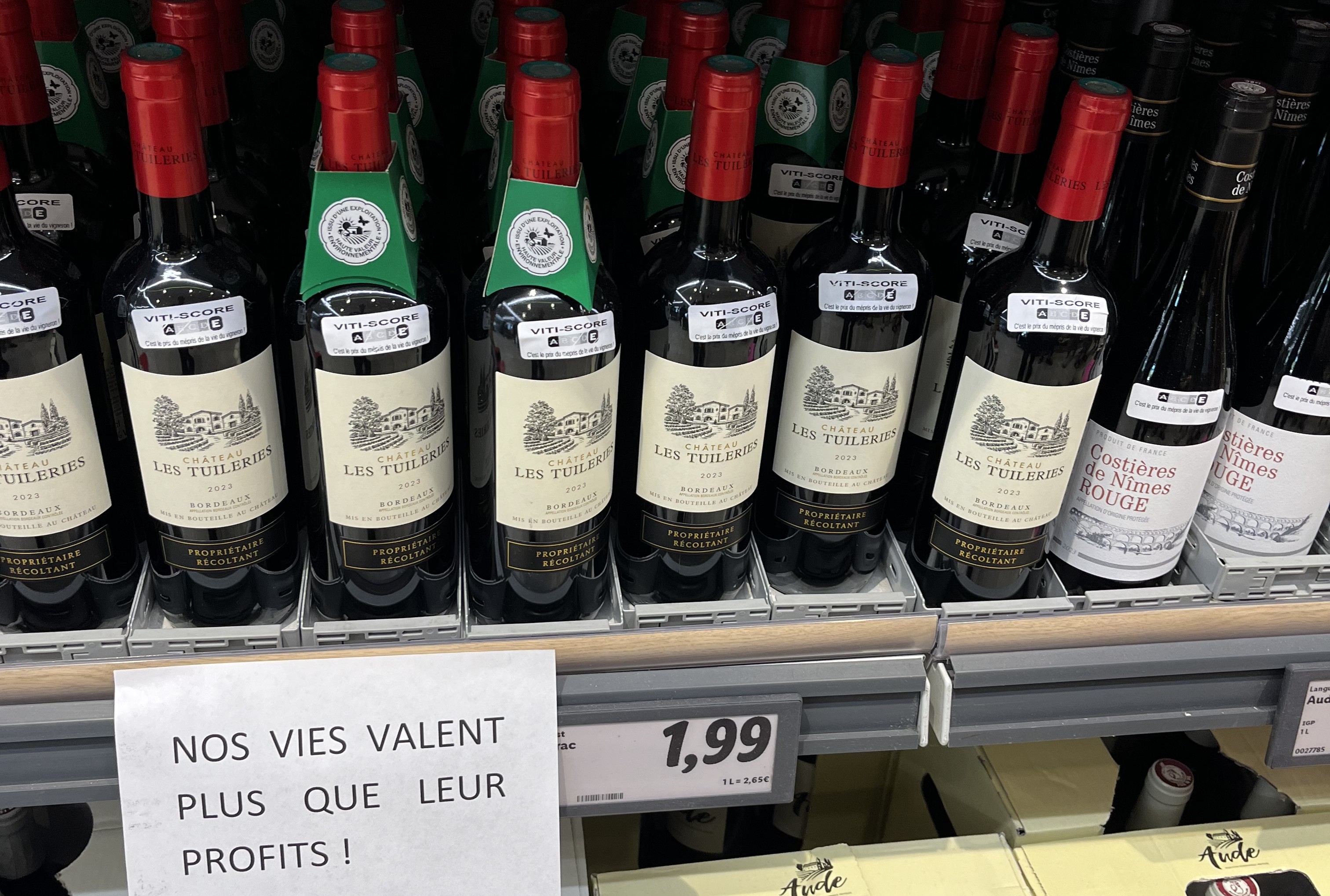 « Quand dans un même rayon le vinaigre est plus cher que les vins, il y a un problème » grince Vincent Collineau, coprésident de la CR33, présent avec une trentaine de manifestants à La Réole. L’entrée du Lidl ayant été bloquée sur la commune, et le magasin n’ouvrant pas, ce groupe est allé visiter les magasins Netto et Intermarché pour sticker d’un "Vitiscore E" « tous les vins non-viables pour leurs producteurs, vendus en dessous de 2,5 € en GD. Ces vins : en dessous d’un prix rémunérateur n’ont pas à être vendus. Il n’y a pas que Lidl, tous les distributeurs et les négociants qui vendent à bas prix sont dans le même lot. Ils sont complices de l’enterrement des viticulteurs. On perd un agriculteur tous les trois jours en Gironde dans l’indifférence générale ! »