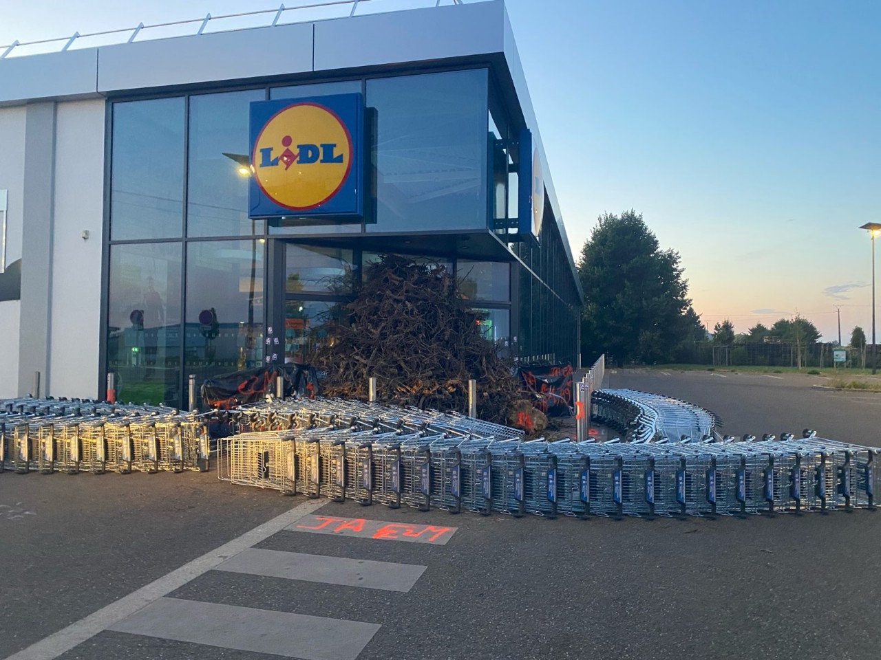 ignerons au Bordeaux désespoir... Ce samedi 12 mai dès 6 heures, les syndicats viticoles visitent cinq magasins Lidl de Gironde en y déposant qui des ceps de vigne et bâches sur les parking, qui des caddies à l’entrée, qui des stickers "Vitiscore E : c’est le prix du mépris de la vie du vigneron". Dans une forme d’union sacrée pour le prix rémunérateur des vins, ces actions éclairs ont été organisées en moins de 24 heures par la Fédération Départementale des Syndicats d’Exploitants Agricoles (FDSEA 33), les Jeunes Agriculteurs (JA 33), la Coordination Rurale (CR33), le Collectif Viti 33 et l’AOC Bordeaux, en réaction à la promotion de la marque Lidl la Croix de Ceyssac à 1,39 € la deuxième bouteille (du 3 au 9 juillet derniers, avec une réduction de 30 % par rapport à la première vendue 1,99 €). « LIDL, le mépris des bonnes choses. Notre vin vaut mieux que ça ! Stop aux prix indécents » alertent les slogans vignerons visant les magasins de Bourg, Coutras, La Réole, Libourne et Saint-André-de-Cubzac.