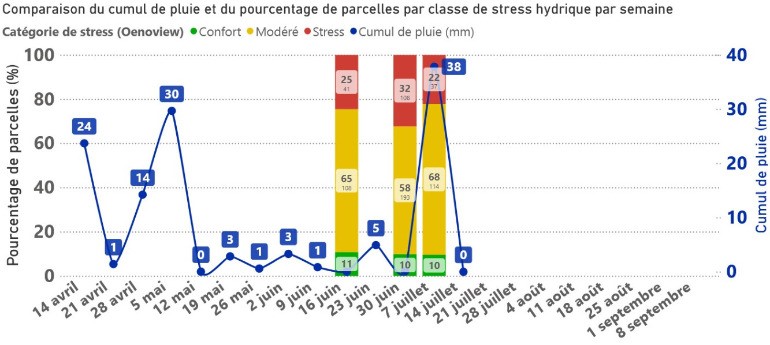 Graphique des données du réseau hydrique ICV pour l'Hérault: en courbe bleue, les cumuls de pluie hebdomadaires relevés par quatre point météo Weenat répartis sur le territoire ; en barres, l’état hydrique des 160 parcelles suivi par Oenoview Hyd, à partir d’acquisitions réalisées les 22 et 30 juin, puis les 2 et 10 juillet.