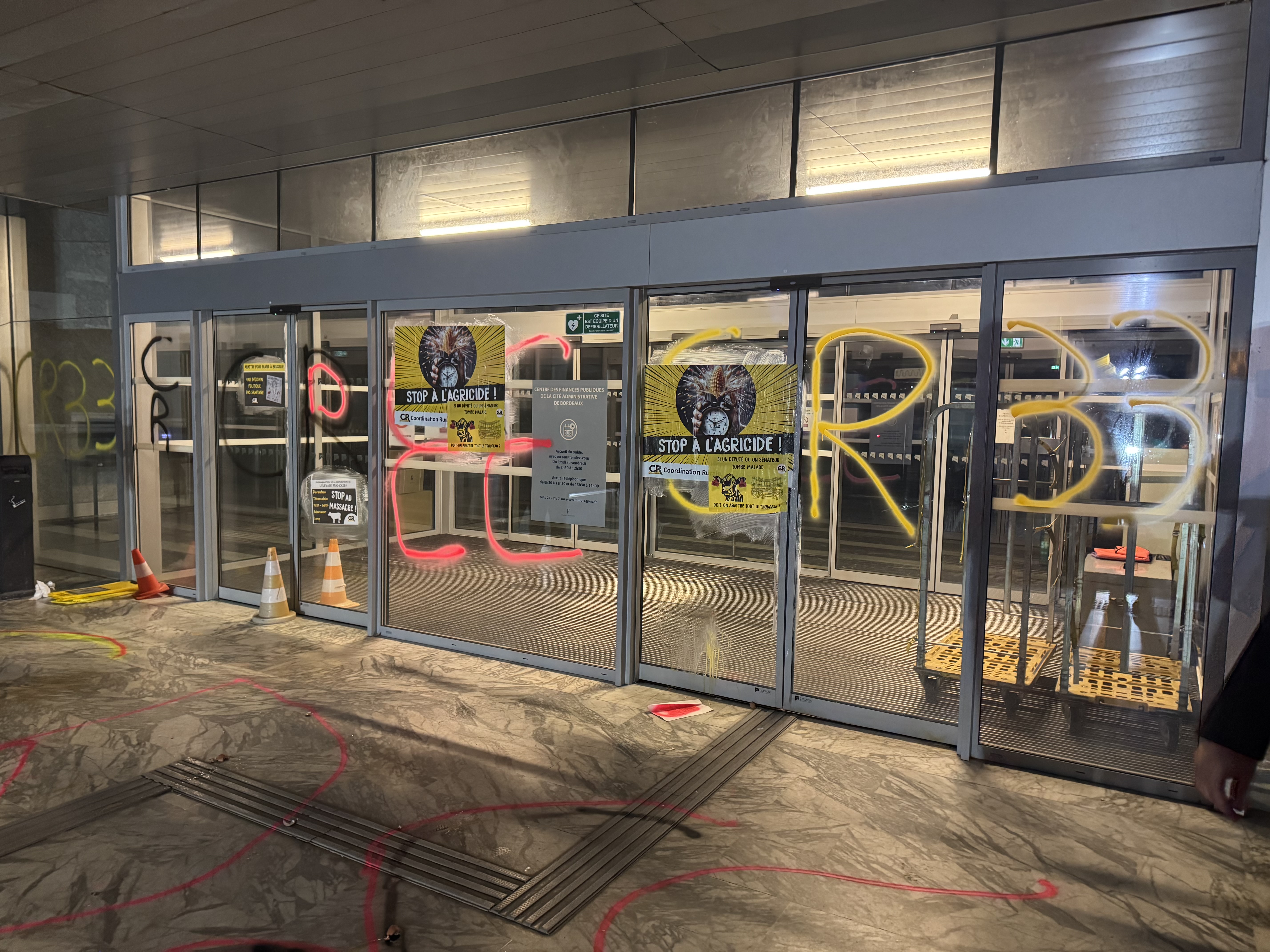 anifestant dans la nuit du 11 au 12 décembre à Bordeaux, la Coordination Rurale de Gironde (CR33) a donné « lieu au déversement de plusieurs bennes de déchets agricoles, à proximité de plusieurs établissements : la Cité Administrative, la Préfecture, le Comité interprofessionnel des vins de Bordeaux (CIVB), la Cité du Vin ainsi que la place de la Bourse. À Bruges, la Direction départementale de la Protection des populations (DDPP) a également été la cible de dépôt de déchets agricoles ainsi que la suspension d’une carcasse animale et des tags et collages sur la façade du bâtiment » liste la préfecture de Gironde dans un communiqué. Les services de l'Etat précisent à Vitisphere que les sites visés sont accessibles dès ce matin (après intervention des services techniques de Bordeaux-Métropole) et que « l'évaluation des dégradations est en cours. Le préfet se réserve la possibilité de déposer plainte en fonction des résultats cette évaluation. » Il n'y a pas eu d'interpellation de manifestants.