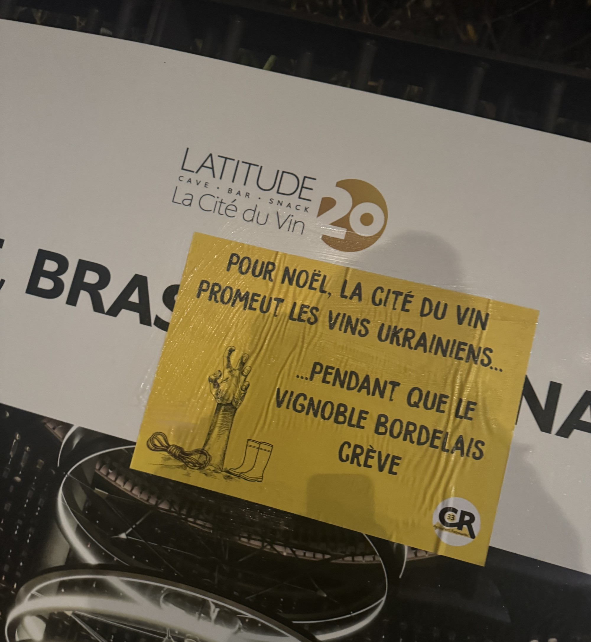 « Cet atelier fait partie de notre programmation culturelle, dans laquelle nous mettons chaque mois à l’honneur des régions viticoles françaises et internationales. Il se trouve que la semaine prochaine, c’est l’Ukraine » indique-t-on à la Cité du Vin, qui rappelle sa vocation pour le patrimoine culturel universel de la vigne et du vin. « Nous avons d’autres activités au cours desquelles les vins de Bordeaux sont à l’honneur » et représentent « plus de la moitié des vins dégustés à la Cité du Vin » indique cette source (atelier Bordeaux 360° toute l’année, prochaine édition du parcours sensoriel 100 % Bordeaux…). Contacté, le CIVB n'a pas donné suite à date de publication. S’il y avait déjà eu cet été une manifestation de la CR 33 au CIVB, c’est une première pour la Cité du Vin, qui avait servi de point de départ à des actions contre le Crédit Agricole et la Mutualité Sociale Agricole (MSA) le 23 octobre dernier, pour demander des comptes après le suicide de l’un des leurs, le viticulteur Jonathan Mayer.