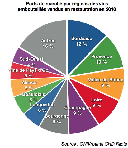Malgré une diminution de ses parts (12,2 % en 2010 contre 13,1 en 2011), les vins de Bordeaux dominent le marché des vins servis en restauration à table. Dans la catégorie ‘‘autres’’ on trouve dans le détail d’autres vins effervescents, qui ont réalisé une bonne progression entre 2009 et 2010 (passant de 3,4 à 4,4 %), ainsi que les autres vins de pays (3,6 %), les vins étrangers (3,5 %) et les vins du Roussillon (3 %). Les 1,8 % restants sont constitués de vins ne rentrant pas dans ces catégories.