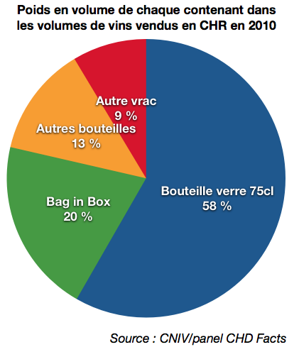 ranceAgriMer vient de publier la suite des résultats de son suivi annuel des ventes de vin en réseau Café Hôtels et Restaurants (CHR). Si la première partie de l’étude revenait sur la typologie des acteurs de ce réseau de distribution et sur leurs fournisseurs (pour en savoir plus, cliquer ici), cette seconde partie se penche sur les relations entre contenants et ventes de vin. Réalisée en 2010 par le cabinet CHD Expert auprès de 3 010 répondants, cette enquête confirme l’hégémonie des bouteilles de 75 cl sur les volumes vendus en CHR, comme on peut le voir sur le camembert ci-dessous.