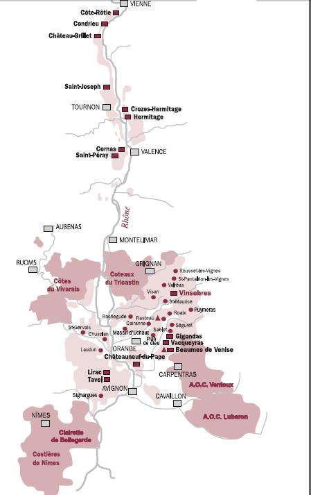 a Vallée du Rhône représente un vignoble des plus vastes de France. Sa situation géographique en fait un axe de communication privilégié entre le monde méditerranéen et l'Europe septentrionale ou atlantique. En 600 avant notre ère, les phocéens cultivaient la vigne autour de la cité, et en 71 de notre ère, on élaborait déjà du vin en Côte-Rôtie et à l’Hermitage, c’est dire le caractère ancestral de la culture de la vigne dans cette région. Dans la Vallée du Rhône, on observe une nette séparation entre le nord et le sud, tant au niveau des types de sols, des climats, que des cépages. C’est pourquoi, on considère deux régions distinctes : les Côtes du Rhône Septentrionales dans le nord de la vallée et les Côtes du Rhône Méridionales dans le sud de la vallée. Carte : InterRhone Cliquez sur la carte pour l'agrandir.