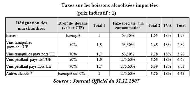 Côté fiscalité, cette dernière ne se limite pas aux droits de douane, puisque les alcools sont également soumis à une taxe spéciale sur la consommation ainsi qu’à une taxe sur le volume d’alcool, ces deux taxes ne se cumulant pas : l’administration turque applique à une expédition donnée la taxe qui lui permet d’obtenir le montant le plus élevé. La taxe sur le volume d’alcool a été réduite de 45 % sur les vins de table en février 2008.
