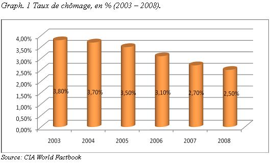 ÉconomiePIB : 106,1 Mlrds USD en 2006, (87,4 Mlrds USD en 2005). PIB par habitant à parité de pouvoir d'achat ($) : 7 800 USD en 2006. Croissance économique annuelle : 7,1 % (2006). Taux d'inflation : 12,8 % (2007). Taux de chômage : Le taux de chômage officiel est de 2,3 %, mais l’Organisation Mondiale de Travail calcule que le taux réel est de 7 % (2007).