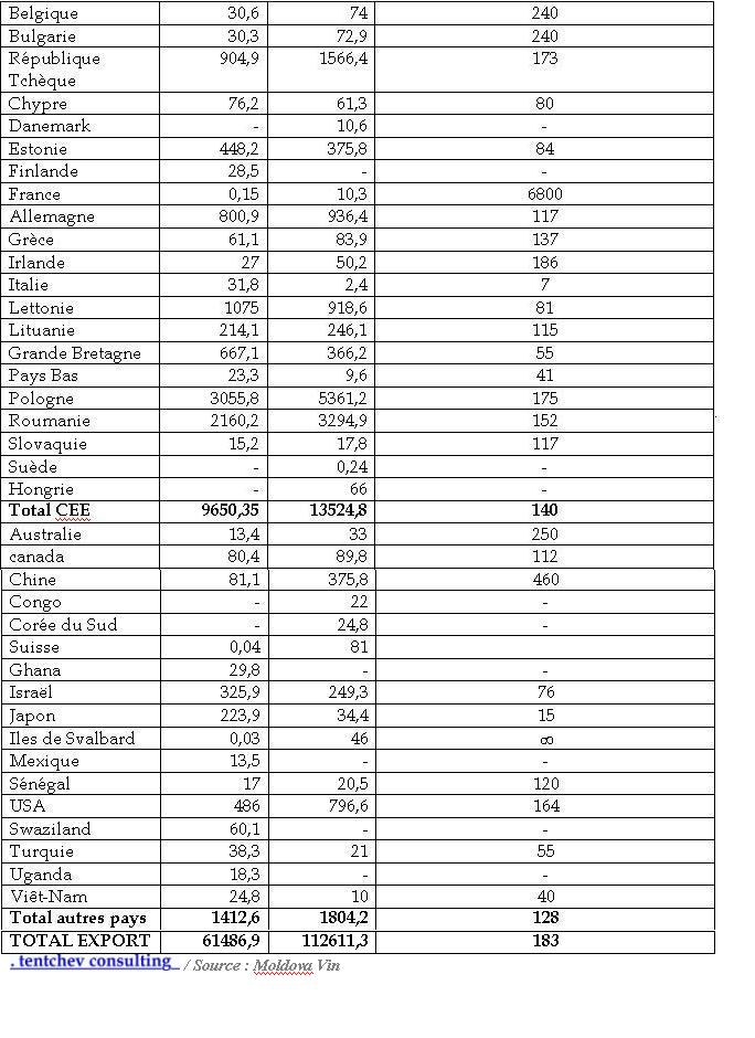 Selon les données du Deutsches Weininstitut, en 2007 la Moldavie a exporté 1,5 mln hL de vin.