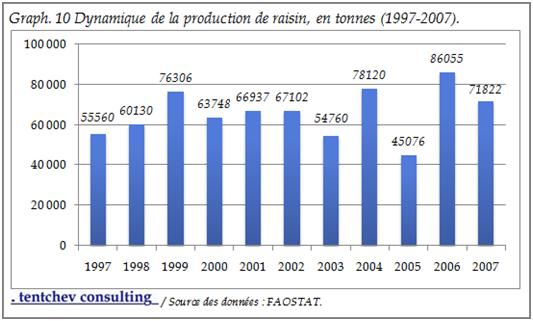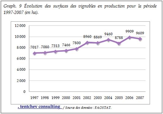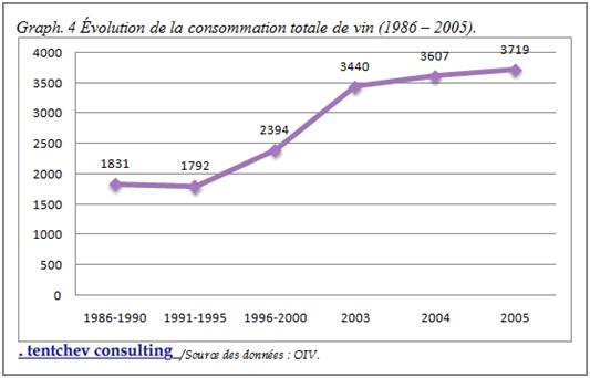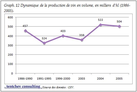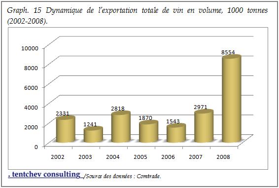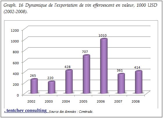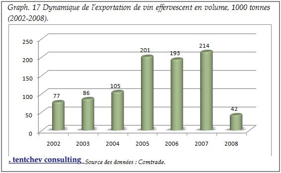 Entre 2004 et 2008, les parts des vins tranquilles et des vins mousseux dans les exportations en valeur ont baissé de 86,3% à 83,3% et de 2,9% à 2,1% respectivement, alors la part des vins en vrac a augmenté de 10,8% à 14,6%.