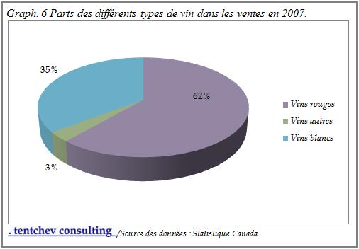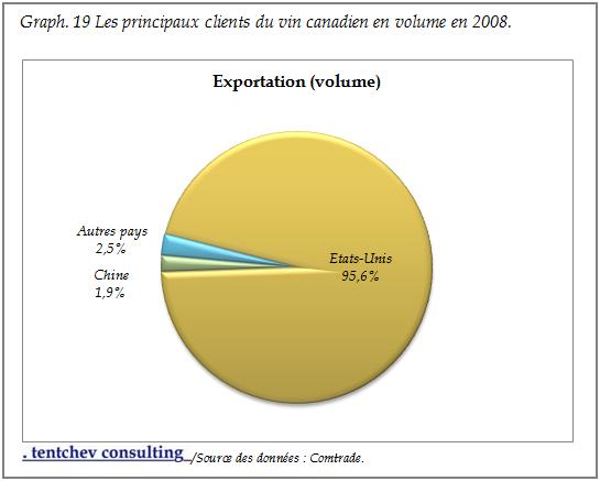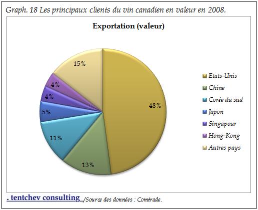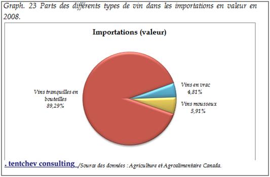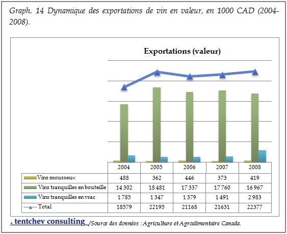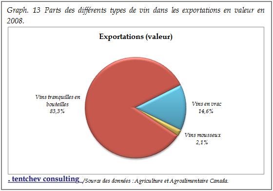 Les vins tranquilles en bouteilles occupent la plus grande part dans les exportations canadiennes, avec 83,3% en 2008 en termes de valeur.