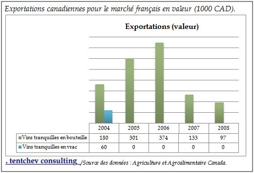 Depuis 2005, le Canada a exporté uniquement du vin tranquille en bouteilles pour la France.