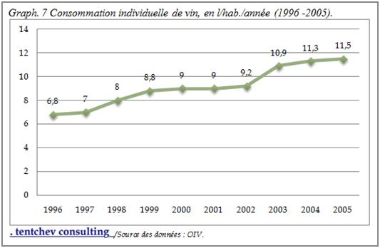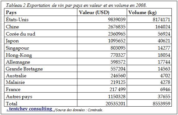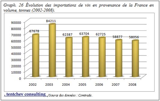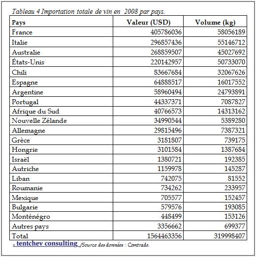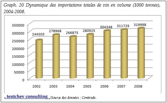 (avec 311 millions de litres importés) le 5e en valeur (le montant total de ses importations était de l'ordre de 1 469 millions d'USD). La consommation de vins importés a augmenté de 31,98 % pour atteindre 26 millions de caisses en 2007.