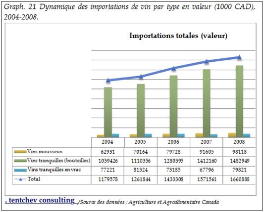 Entre 2004 et 2008, les parts des vins tranquilles et des vins mousseux dans les importations en valeur ont augmenté de 88,12 % à 89,29 % et de 5,34 % à 5,91 % respectivement, alors la part des vins en vrac a baissé de 6,55 % à 4,81 %.