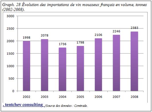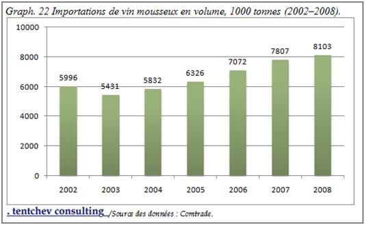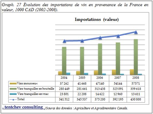 Selon les données de Comtrade, entre 2002 et 2008 les importations françaises de vin mousseux au Canada ont presque triplé en valeur, passant de 19,5 mln USD à 54,2 mlns USD.