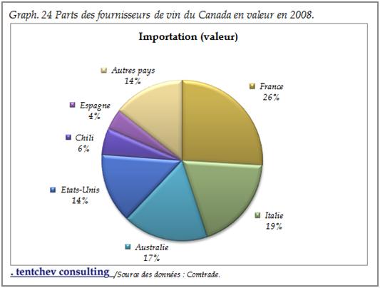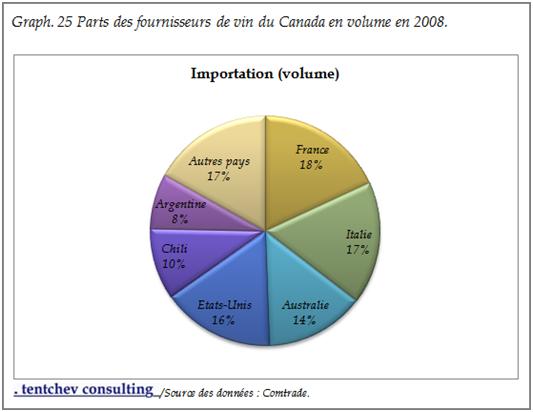 La France, l'Australie et l'Italie ont tous une part de marché en valeur supérieure à celle en volume ; cela indique que les importations canadiennes en provenance de ces pays se positionnent sur des créneaux de prix relativement élevés. Les États-Unis et le Chili sont également des fournisseurs importants mais ils se positionnent sur des vins moins chers. Leur part de marché en volume est inférieure à celle en valeur.