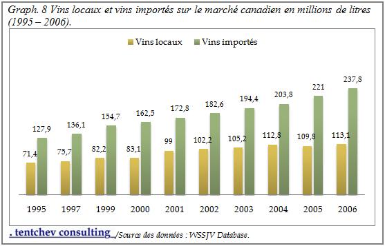 Près des trois quarts des vins vendus au Canada proviennent d'autres pays. La croissance des ventes de vins importés a été plus du double de la croissance des ventes de vins canadiens.