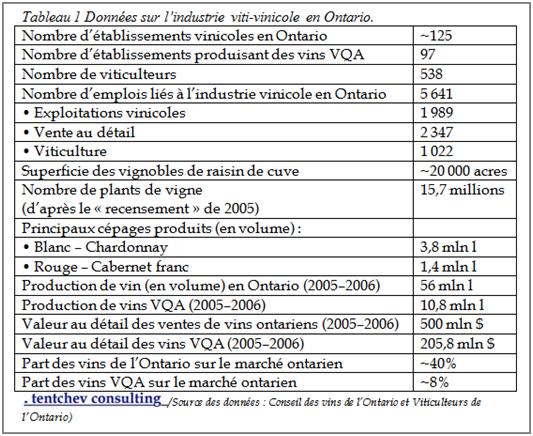 L'Ontario est la plus importante province viti-vinicole du Canada, générant près de 80 % de la production canadienne. Les raisins se classent au deuxième rang, après les pommes, parmi les produits agricoles de l’Ontario, et représentent 15 % de la valeur à la ferme de la production commerciale des fruits dans la province.