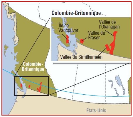 L'Ontario et la Colombie Britannique produisent à elles seules plus de 95% du vin canadien.