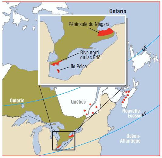 La température est le facteur crucial dans la culture de la vigne, particulièrement au Canada où se situe la limite Nord de cette culture sur le continent américain. Les régions de production de vin sont situées entre les latitudes 41 et 50 º, ce qui les place dans les mêmes zones que les régions de Champagne en France, Rioja en Espagne, Sud de l’Oregon et Nord de la Californie aux États-Unis, ainsi que la région de Chianti Classico en Italie.