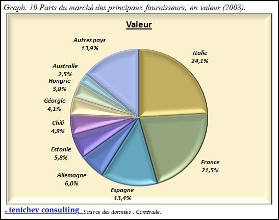 Après avoir été le premier fournisseur de la Lettonie en valeur en 2006 et 2007, la France a perdu sa position de leader en 2008. Tandis qu’elle possédait 35% du marché en 2006, elle n’en avait plus que 22% en 2008. Contrairement à elle, l’Italie a pu gagner des parts du marché, passant ainsi de la seconde à la première position, avec 24% du marché. A la troisième place, l’Espagne détient une position stable sur le marché en dépassant l’acteur important qui est l’Allemagne.