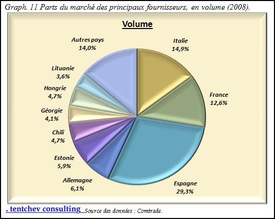 L’Espagne est le plus gros fournisseur de vin en volume en 2008, suivie par l’Italie et la France.