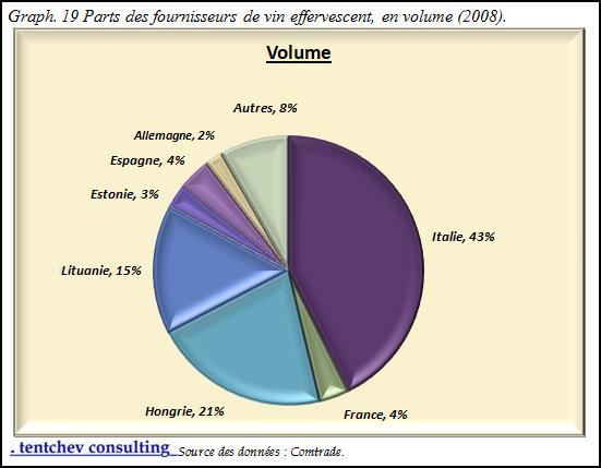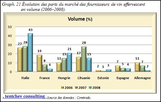 Pour les trois dernières années, l’Italie est le premier fournisseur de vin effervescent en termes de quantité. En même temps, la France a glissé de la deuxième à la cinquième position en tant qu’exportateur en volume, se rangeant derrière l’Espagne.