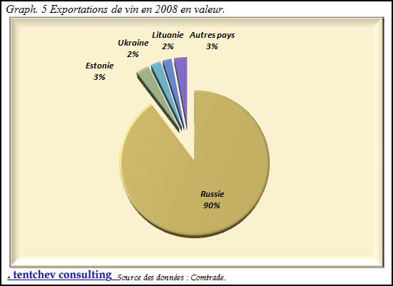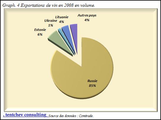 En 2008, le pays a exporté 12 972 tonnes de vin pour une valeur de 70 313 255 USD. La Fédération de Russie a été le premier client, avec 10 983 tonnes pour 63 242 880 USD, soit 85% des exportations en volume et 90% des exportations en valeur.