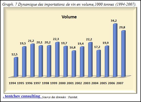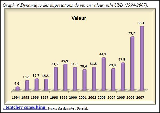 Les importations de vin ont augmenté près de vingt fois en valeur entre 1994 et 2007, pour atteindre un sommet de 88,1 millions d’USD.