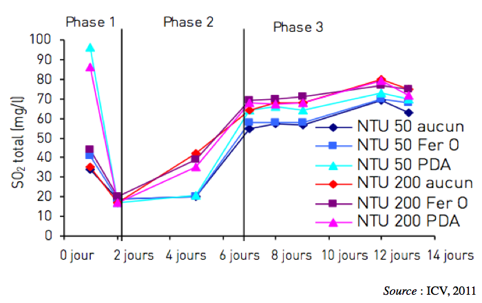Un suivi journalier des cinétiques d’évolution du SO2 dans les moûts en cours de fermentation alcoolique a été réalisé. Toutes ces courbes d’évolution des quantités de SO2 total ont la même allure (sauf pour les modalités non inséminées, qui n’ont pas de première phase). D’abord il y a une phase rapide de consommation durant les premières 48 heures de début de la fermentation alcoolique, on arrive alors à un niveau minimum de SO2 total. Ensuite on note une production variable (selon le type de levures) de SO2 sur les quatre journées suivantes de fermentation, c’est à dire pendant la phase de croissance de la population de levures. Un plateau de SO2 total est ensuite atteint, n’augmentant que peu jusqu’à la fin de la fermentation alcoolique. On peut voir ci-dessous ces phases, sur les courbes d'évolution du SO2 total pour diverses turbidités de chardonnay en 2009, à 12°C et avec un sulfitage préfermentaire de 5 g/hL.