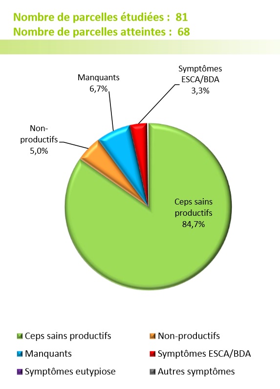 e Val de Loire tient depuis 2013 un « Observatoire annuel des maladies du bois », grâce au suivi par les chambres d’agriculture d’un réseau de 81 parcelles – soit 22 500 pieds – sur différents cépages et secteurs de la région. Celui-ci permet de suivre la proportion de pieds sains productifs, les pieds manquants (ou morts), les pieds non productifs (jeunes plants), mais aussi ceux atteints de symptômes d’esca-BDA.