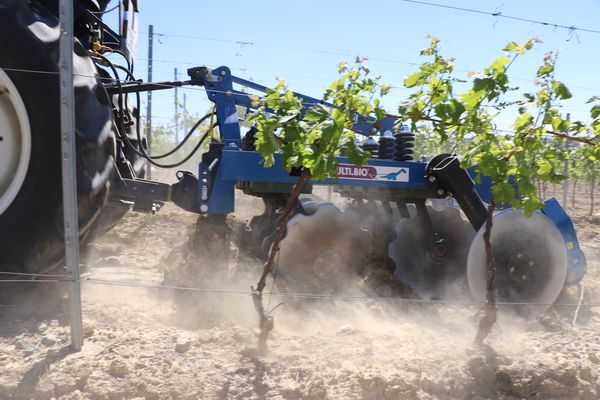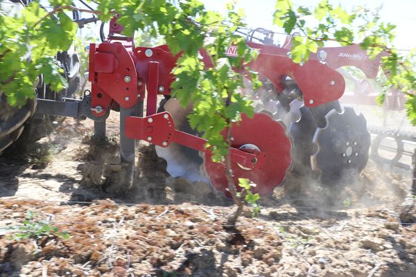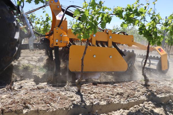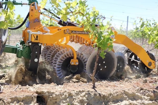 ui dit vignes propres, ne dit pas forcément glypho ! Les outils portés à disques ont fait le show et soulevé la poussière ce mercredi 15 mai après-midi à Cavanac, près de Carcassonne. Pour recevoir cette démonstration, la parcelle choisie est au coeur de l’aire audoise de 175 000 ha du captage prioritaire pour l’eau potable de Maquens, alimentant la région de Carcassonne. C’est la Chambre d’agriculture de l’Aude avec la fédération régionale de Cuma qui sont à l’origine de l’initiative de ce test. L’objectif est de faire la démonstration de l’efficacité de ces « pulvérisateurs » à disques pour la destruction des adventices installées dans les inter-rangs. La problématique est multiple : diminuer les herbicides, et proposer une alternative aux outils à dents, moins rapides, à effort de traction plus élevé et susceptibles d’accélérer l’érosion des sols. Cinq constructeurs ont répondu à l’appel et sont parfois représentés par des distributeurs. Dans l’ordre des présentations, les modèles et marques sont Vinidisc de Jean de Bru, Disc-o-Vigne d’Agrisem, Discosol de Ferrand, Culti-disque de Gely et Cultibio d'Aguilera (photos ci-dessous).