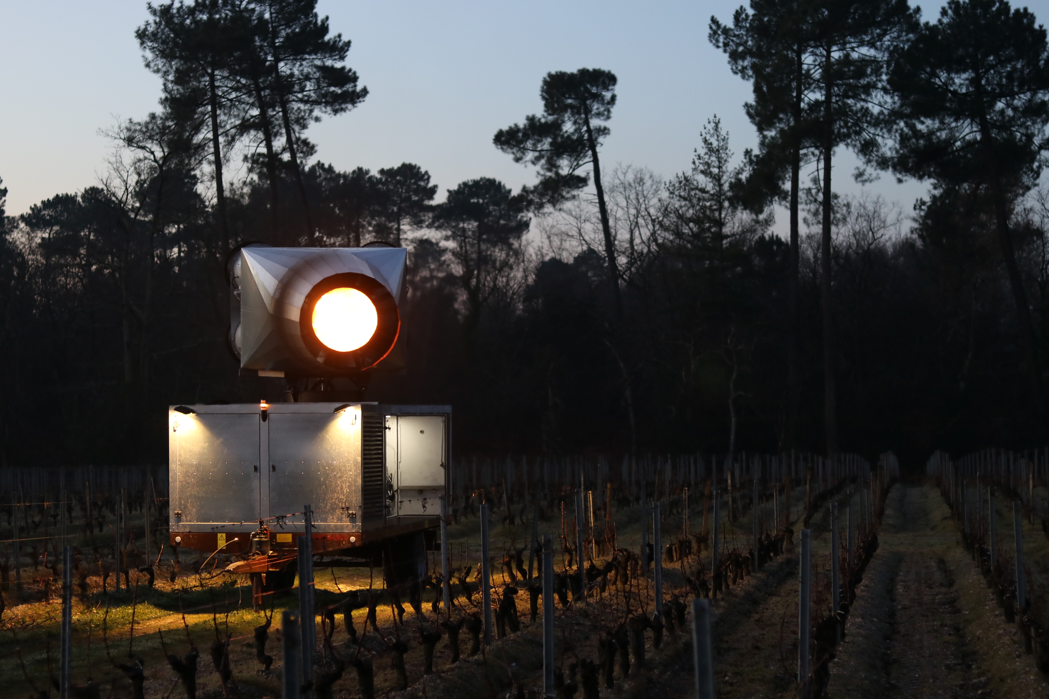 Partant de ce constat, l’entrepreneur bordelais lance un travail de recherche et développement. « L’idée de base était qu’il fallait de la puissance, face à un gel dont on ne connaît jamais l’intensité ni la nature. Et on voulait quelque chose de mobile. Pour qu’un dispositif fixe soit totalement efficace, il faudrait un vignoble d’un seul tenant, et circulaire. Ce qui n’existe pas. On a donc mis le maximum qu’on pouvait mettre sur une remorque. »