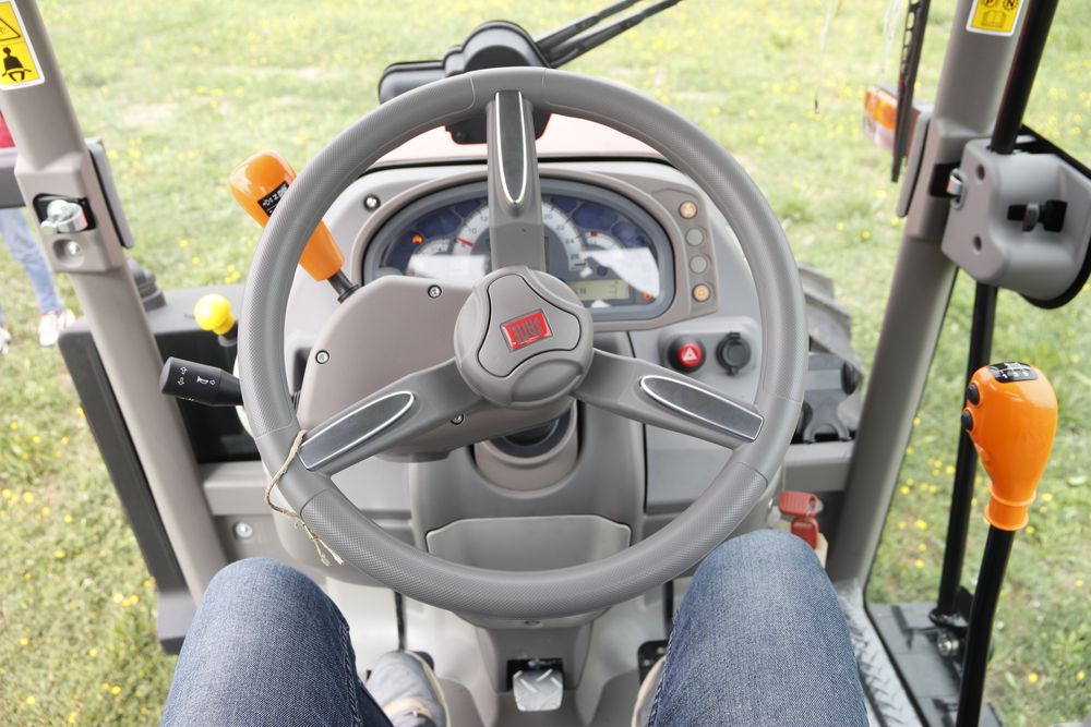 Au démarrage et lors des premiers mètres, on entend peu de bruit. La cabine paraît mieux insonorisée. Il faudrait vérifier ce point lors d'un travail à la prise de force et avec de l’hydraulique. Mais ce n'est pas au programme de la journée. La transmission offre trois rapports sous charge, qui « passent crème ». La diminution du nombre de tour de volants grâce à la fonction appelée « SDD » fait son office : on en fait presque deux fois moins ! La visibilité semble correcte. Là, encore pour s'en assurer, il faudrait évoluer dans une vigne, alors que nous testons l'engin en milieu ouvert.