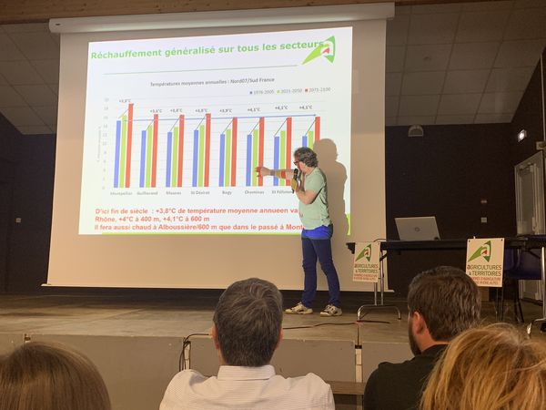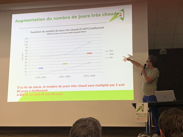 Et il y a de quoi être stupéfait par les données sorties du programme d'évaluation et de prévention au changement climatique "Climat XXI" des chambres d'agriculture. "Les tendances et les chiffres que nous obtenons par simulation doivent aider les agents des chambres d'agriculture face aux producteurs sur les différents territoire, dessine Emmanuel Forel, avant d'entrer dans le vif du sujet. Il y a 3 grands scénarios de prospection climatique du GIEC en fonction des politiques mondiales de limitation des émissions de gaz à effet de serre. D'après les données météo globales relevées, nous constatons que c'est le scénario le plus pessimiste qui se réalise. Nous nous basons donc sur celui-là pour anticiper ce qui pourrait se passer dans nos bassins. D'ici la fin du siècle, la température moyenne annuelle progresserait de +3,8°C. Elle augmenterait même +4°C à 400 ou à 600 m d'altitude : il ferait alors aussi chaud à Alboussière [commune d'Ardèche en altitude à 10 km à l'Est de Valence] que dans le passé à Montpellier entre 1975 et 2005 ! En réalité la température évoluera plus vite en altitude", prévient le conseiller de la chambre d'agriculture d'Ardèche, "la montée des moyennes se fera vers le Nord mais aussi en altitude, c'est un phénomène majeur".